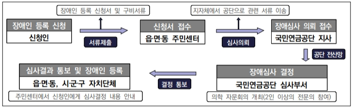 : 행정복지센터에 장애정도심사를 제출해서 장애등록 신청접수를 진행합니다.