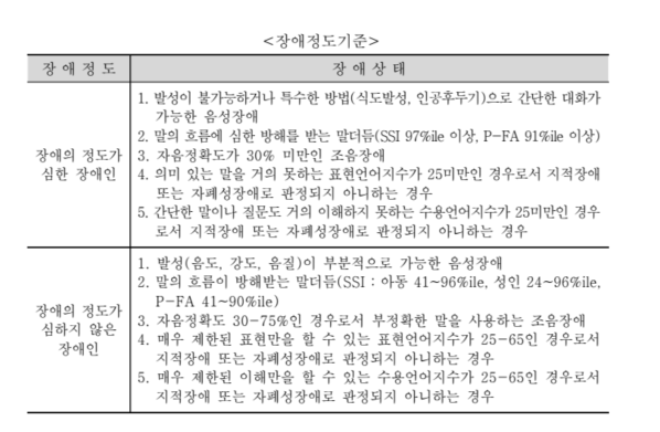 | 1. 장애정도 심사용 진단서 | - 언어장애유형, 원인(진단명) 및 진단소견을 기재 (말더듬, 자음정확도, 표현언어지수, 수용언어지수가 포함되어야 함) |